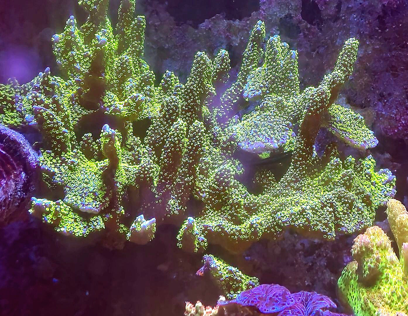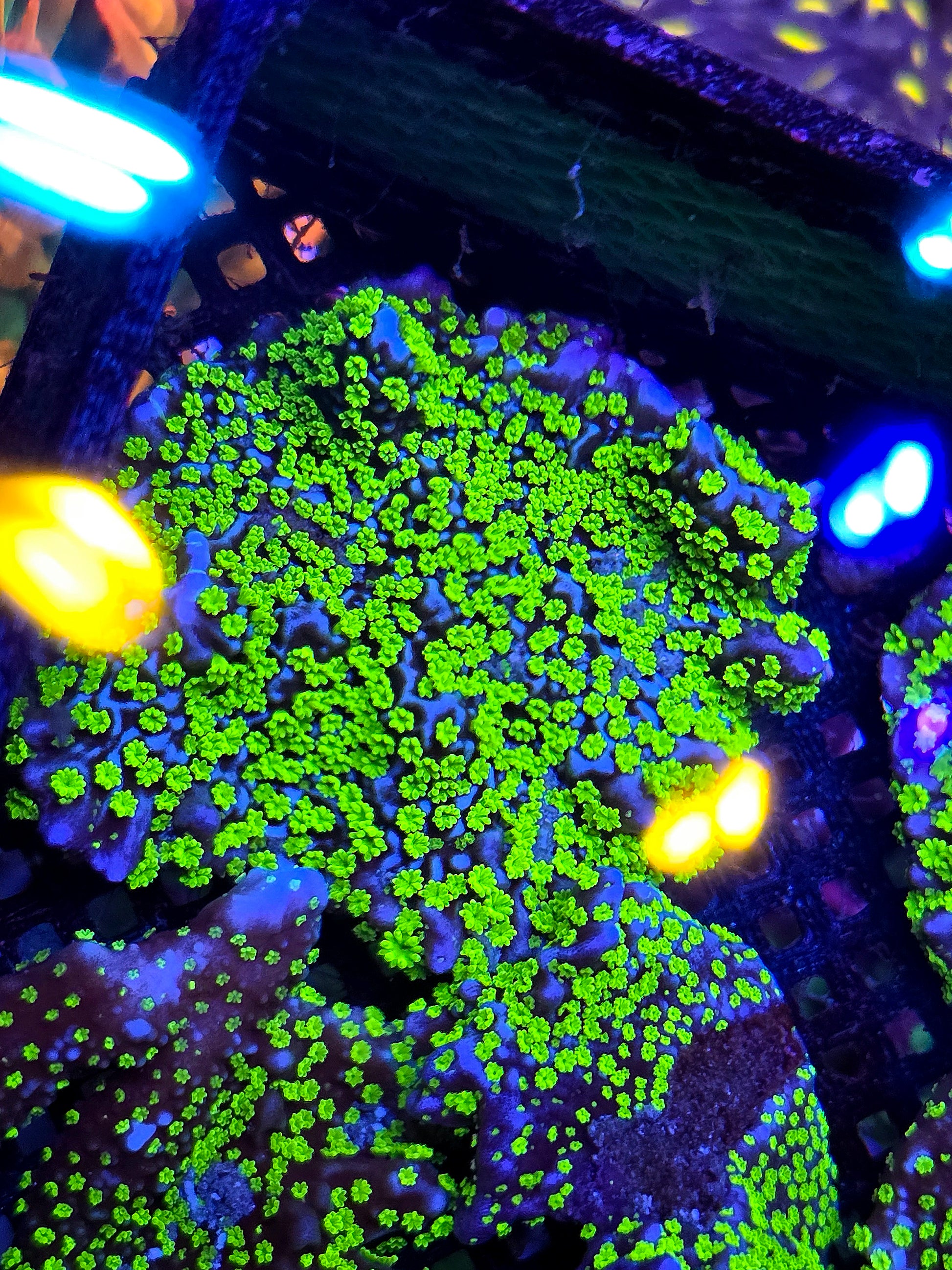 Lighting & Flow Requirements: The Tubbs stellata coral requires moderate to high water flow and bright lighting (PAR 200-300) to maintain its color.